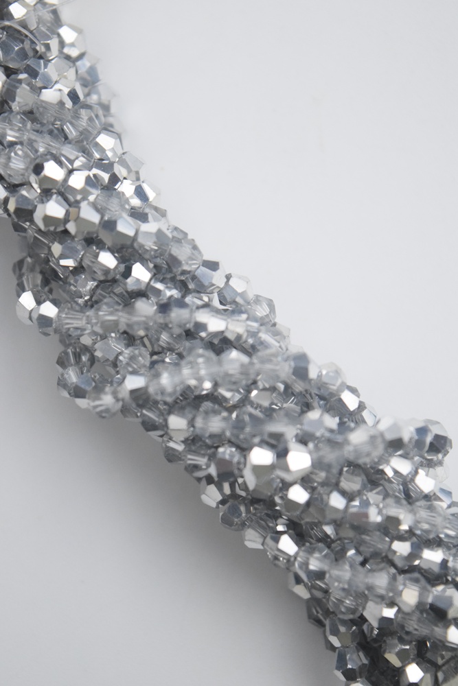 Tira de cristal de roca bicono 4 mm. color plateado 1/2 metalizado y 1/2 translúcido.