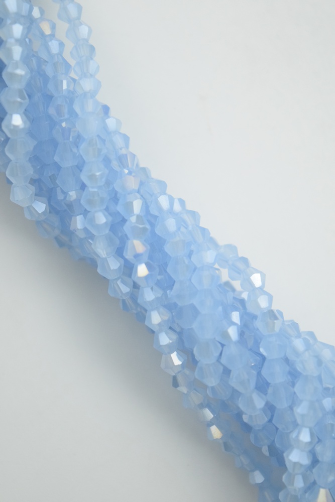 Tira de cristal de roca bicono 4 mm. color celeste semi translúcido.