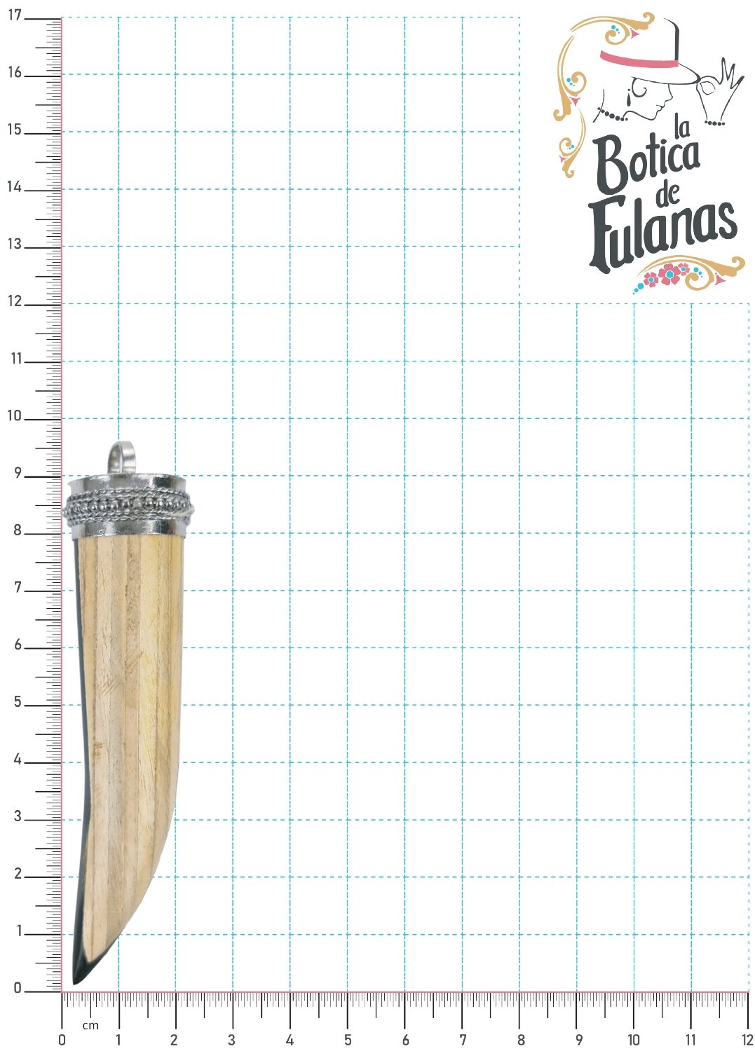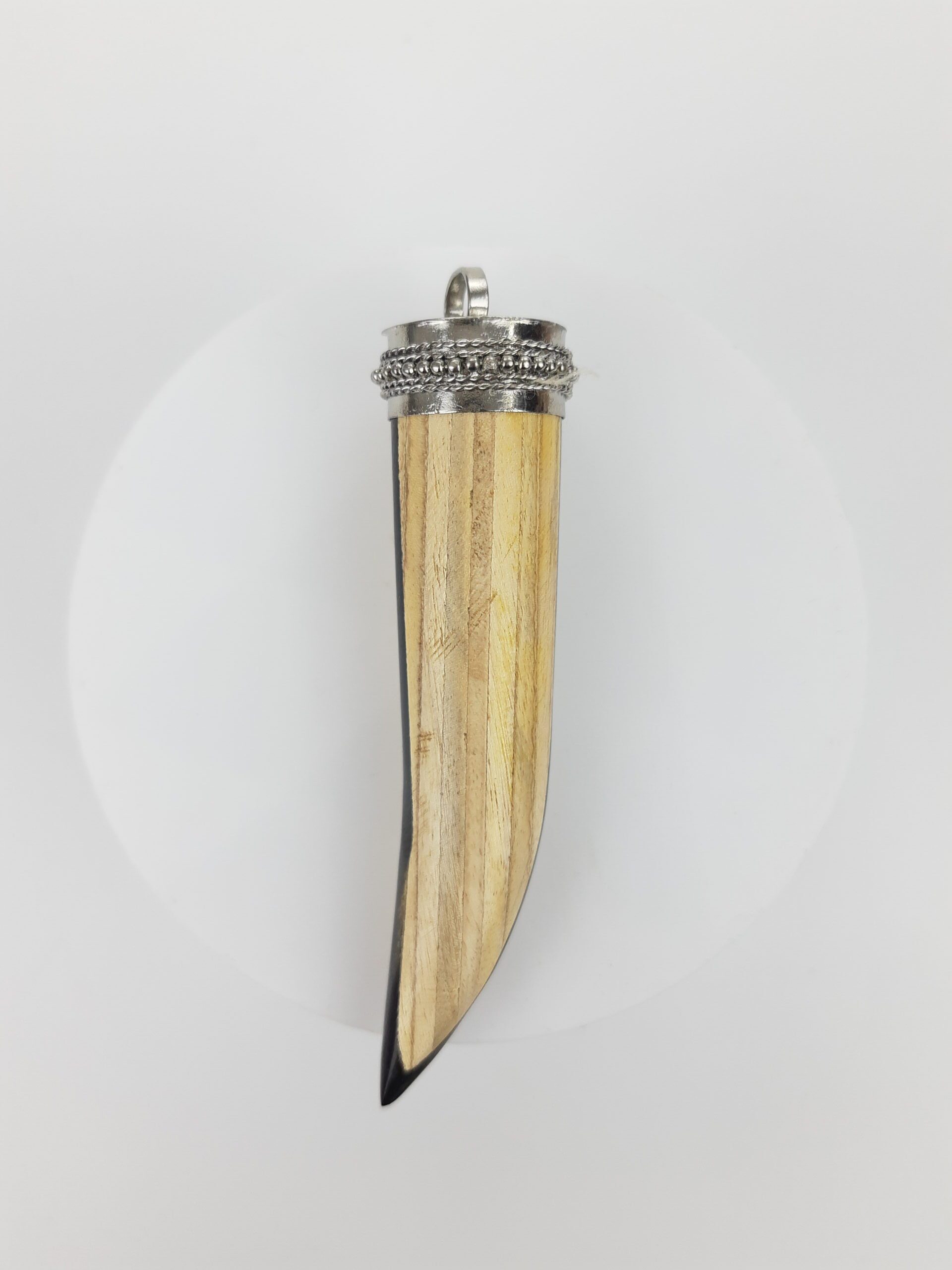 Dije artesanal de asta y madera en forma de colmillo.