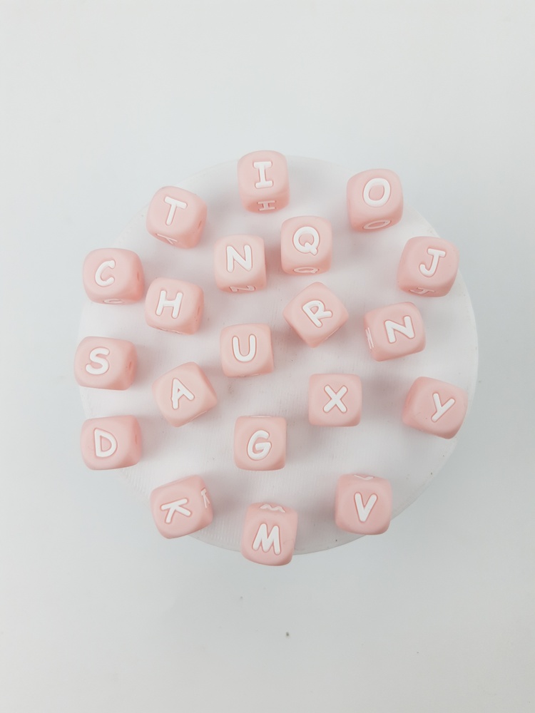Pasante transversales de fimo/silicona libre de BPA, color rosa no tóxicos en forma de cubos con letras.