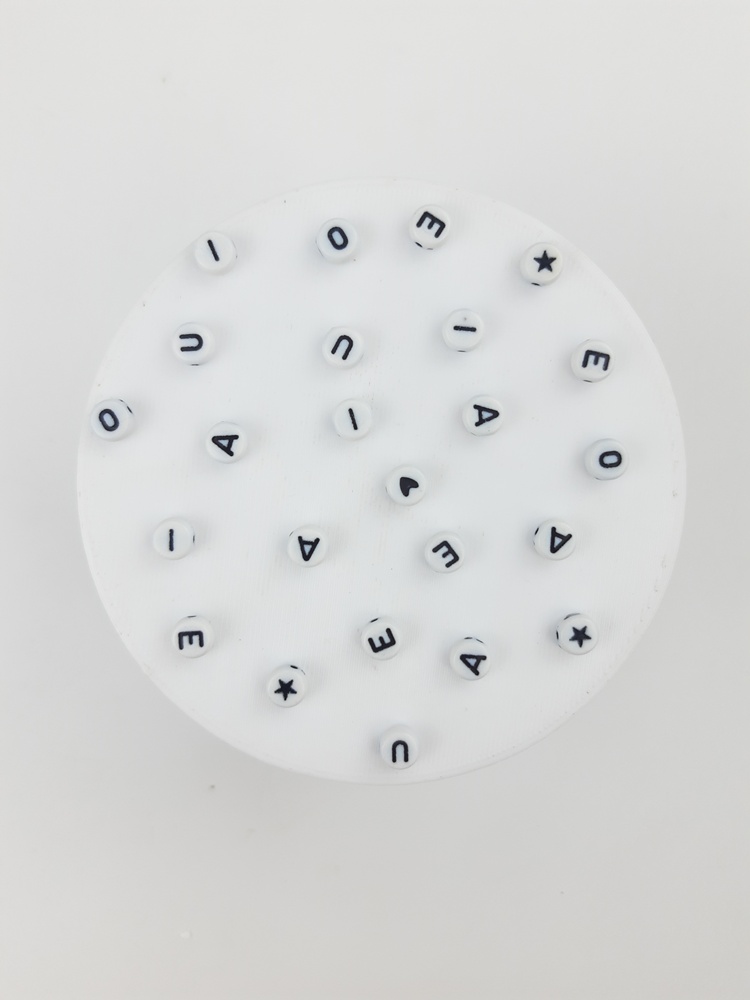 Pasantes transversales de acrílico en forma de pastillas con letras (incluyen solo vocales) y formas (corazones y estrellas).